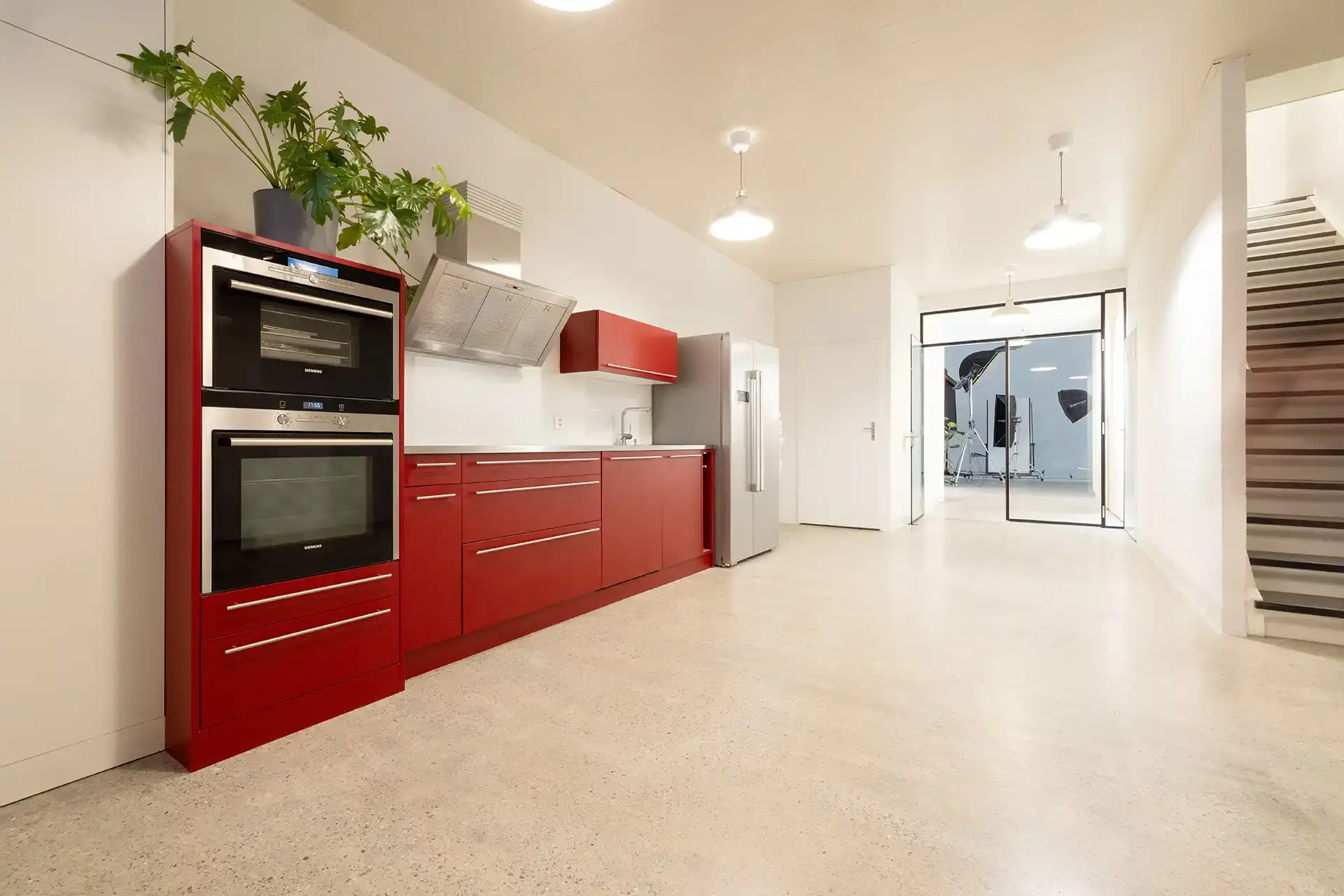 Das Studio umfasst ca. 80 Quadratmeter mit hoher Decke.